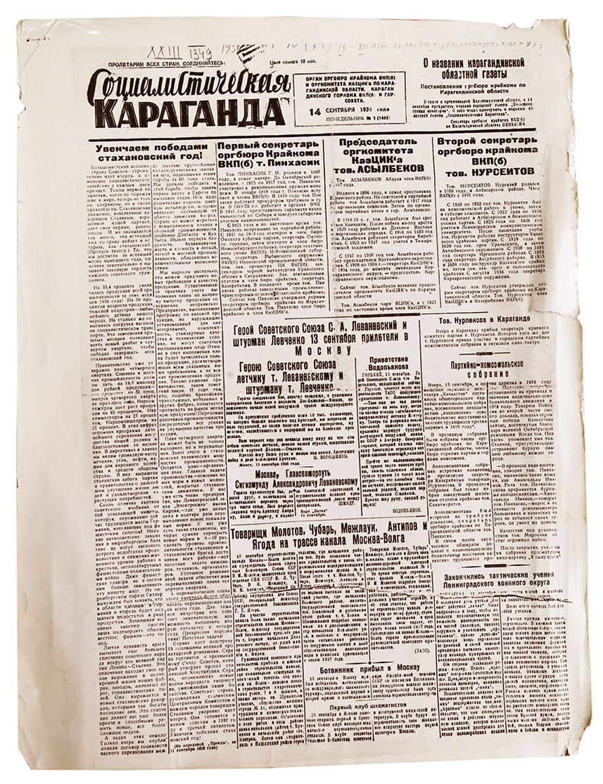 Центральную часть первой полосы «Социалистической Караганды» заняли биографические справки руководителей. Газета знакомила читателя с теми, кому поручено управлять новой областью. Там были опубликованы материалы о первом секретаре оргбюро крайкома ВКП(б) товарище Пинхасике, председателе оргкомитета КазЦИК товарище Асылбекове и втором секретаре оргбюро крайкома товарище Нурсеитове.