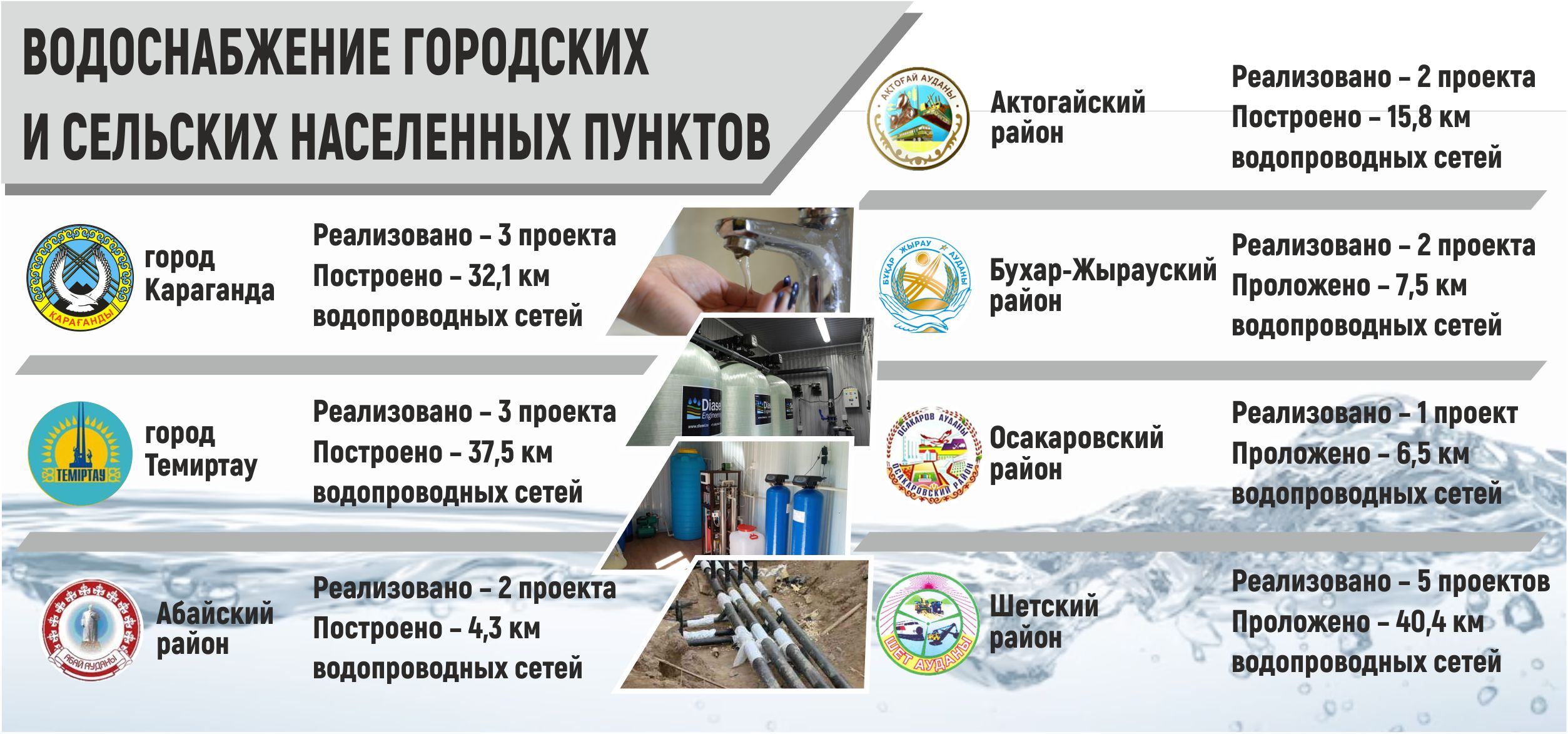 В Нуринском районе проведено строительство водопроводных сетей в селах Куланотпес и Кантай, в малых селах Первое Мая и Кенжарык установлены комплексы очистки воды. В Осакаровском районе централизованное водоснабжение появилось в селе Колхозном, еще в семи – блок-модульные комплексы. В Шетском районе сети проложили в селах Коктенколь, Алихан, Енбекшил, Акой, Кызылкой и Бекет.