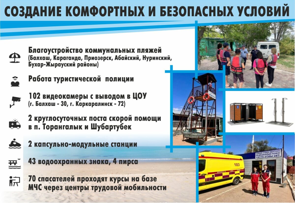 В регионе в качестве основных определены курортные зоны Балхаш и Каркаралы. Разработана областная Дорожная карта по развитию туризма на 2026-2028 годы. Для организованного и контролируемого прохождения туристического сезона создан областной оперативный штаб, заседания которого проводятся на еженедельной основе. В его состав вошли представители профильных управлений, территориальных подразделений уполномоченных органов, служб гражданской защиты, санитарно-эпидемиологического контроля, правоохранительных органов и других.