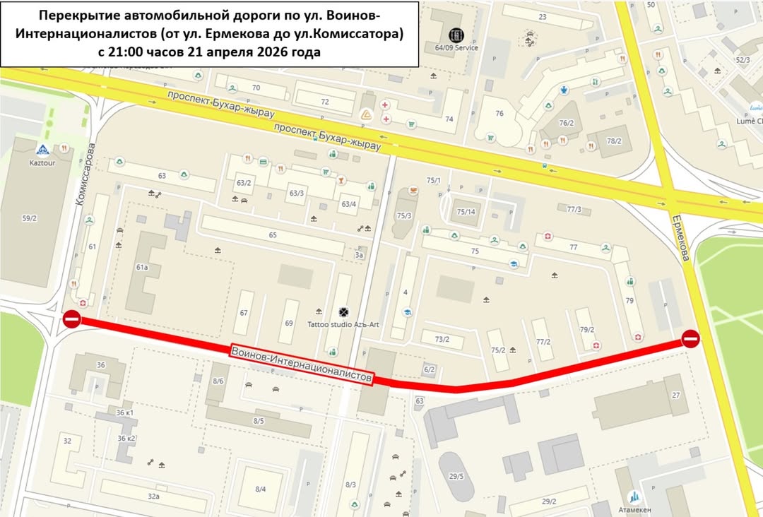 Как сообщили в отделе жилищно-коммунального хозяйства, пассажирского транспорта и автомобильных дорог города, начнутся работы на улице Воинов-Интернационалистов. К среднему ремонту приступят вечером уже сегодня, 21 апреля, в 21:00. Проезд для автотранспорта будет недоступен на участке автодороги от ул. Ермекова до ул. Комиссарова. Автолюбителей просят планировать маршрут заранее.