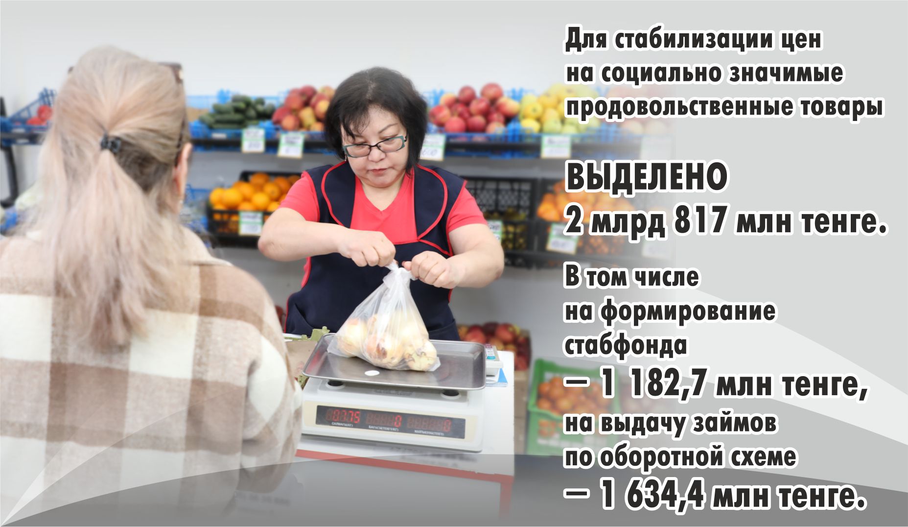 Для стабилизации цен на социально значимые продовольственные товары выделено 2 млрд 817 млн тенге. В том числе на формирование стабфонда – 1 182,7 млн тенге, на выдачу займов по оборотной схеме – 1 634,4 млн тенге.