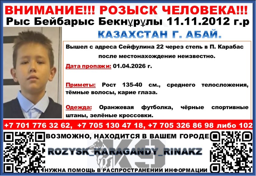 В Абайском районе пропал 13-летний ребенок, который вчера поздно вечером с друзьями отправился пешком из Абая в Карабас, но домой так и не дошел. Он успел отправить несколько голосовых сообщений родным, потом у него разрядился телефон.