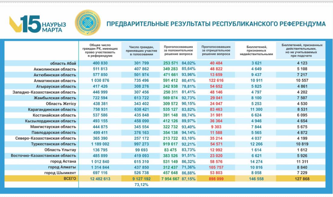 Как сообщил председатель Центральной комиссии референдума Нурлан Абдиров, в процессе волеизъявления в Карагандинской области приняли участие свыше 638 тысяч человек. За принятие новой Конституции свои голоса отдали 83,82 процента избирателей шахтерского региона.
