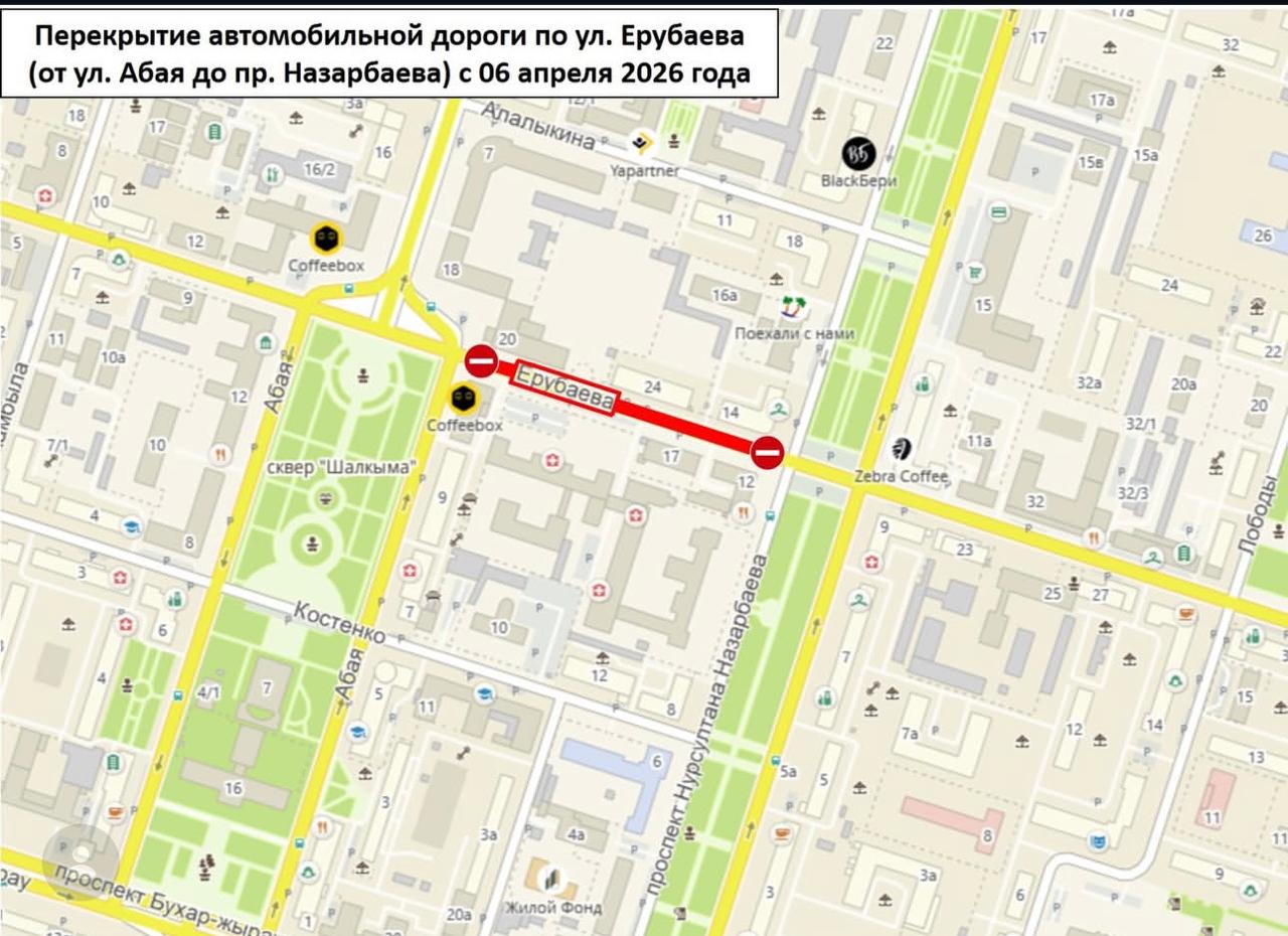 В связи с этим с началом работ по среднему ремонту дороги по улице Ерубаева с шестого апреля будет перекрыт участок от улицы Абая до проспекта Назарбаева.