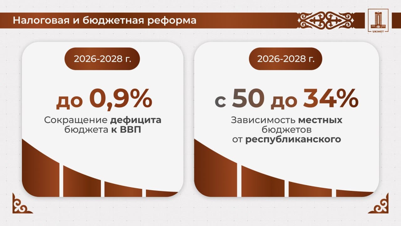 «Принятые решения в налоговой, тарифной и бюджетной политике, цифровом и строительном секторах, а также социальной сфере нацелены на последовательное устранение структурных диспропорций, сдерживающих развитие экономики. Налоговая и бюджетная реформа, позволила сформировать трехлетний бюджет страны без целевых трансфертов из Нацфонда, с планомерным сокращением дефицита бюджета до 0,9% к ВВП к 2028 году. Снижается зависимость местных бюджетов от республиканского с 50% в 2025 году до 34% – в 2028-м», — сказал Премьер-министр.