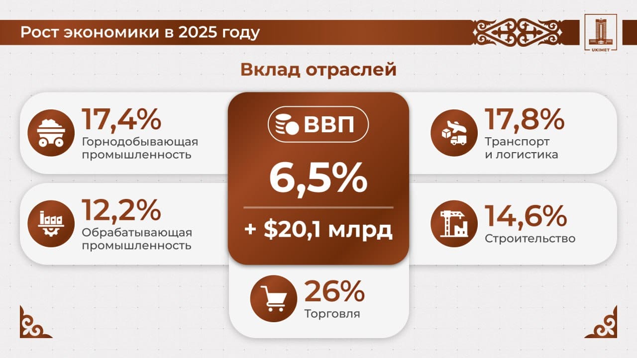 В целом, рост ВВП за 2025 год — 6,5%. Экономическую динамику обеспечило ускоренное развитие ключевых отраслей: транспорт вырос на 17,8%, строительство – на 14,6%, горнодобывающая промышленность – на 17,4%, обрабатывающая промышленность – на 12,2%, торговля – на 26% и сельское хозяйство – на 5,9%.