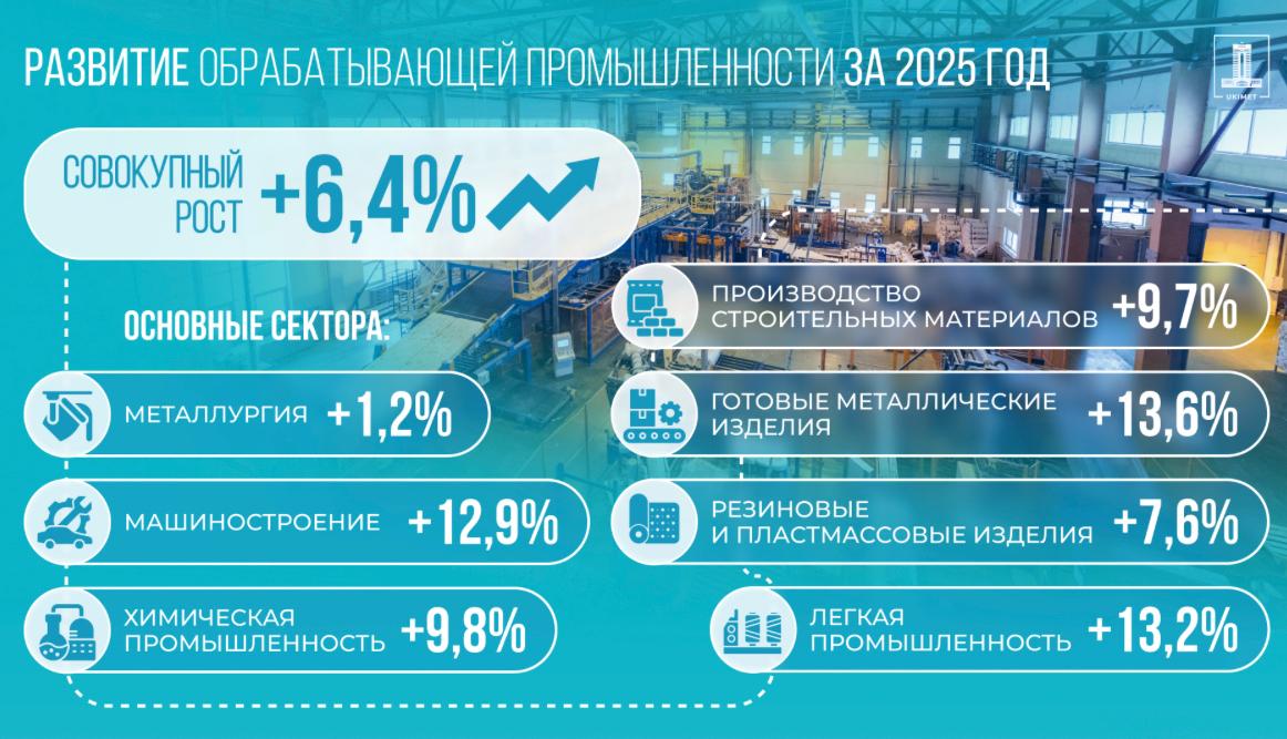 В рамках исполнения поручений Президента Республики Казахстан Касым-Жомарта Токаева по развитию обрабатывающей промышленности, диверсификации экономики и привлечению инвестиций в 2025 году обеспечен устойчивый рост ключевых отраслей. По итогам января–декабря совокупный рост обрабатывающей промышленности составил 6,4%, чему способствовали расширение действующих мощностей и реализация крупных инвестиционных проектов по всей стране.
