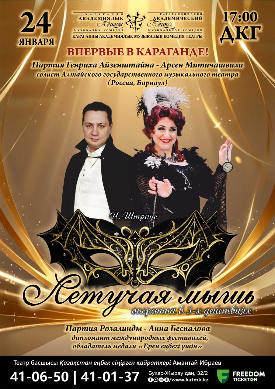 24 января в Карагандинском академическом театре музыкальной комедии состоится блистательная оперетта «Летучая мышь». Карагандинцев и гостей города ожидает вечер великолепной музыки и юмора. Это будет настоящий праздник оперетты.