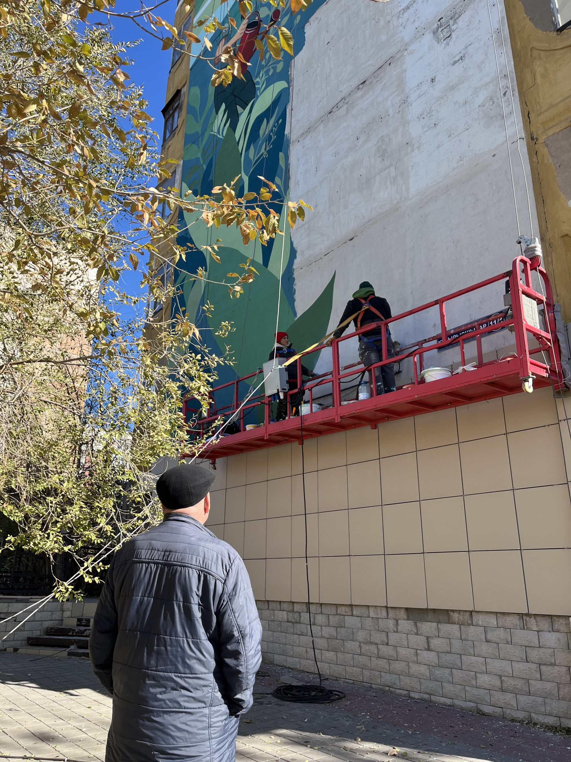 Автор нового мурала — карагандинская художница Бота Жомарт. Кропотливо, шаг за шагом, она воплощала свою идею в жизнь. Результатом работы и стал новый мурал, на котором изображены голубое небо, облака и парень с девушкой, которые поливают из лейки яркую зелень на фоне достопримечательностей города.