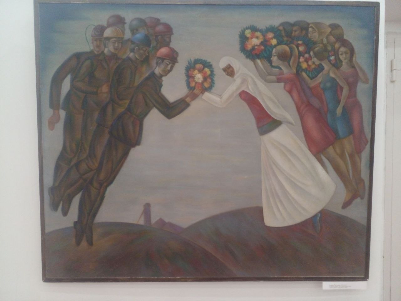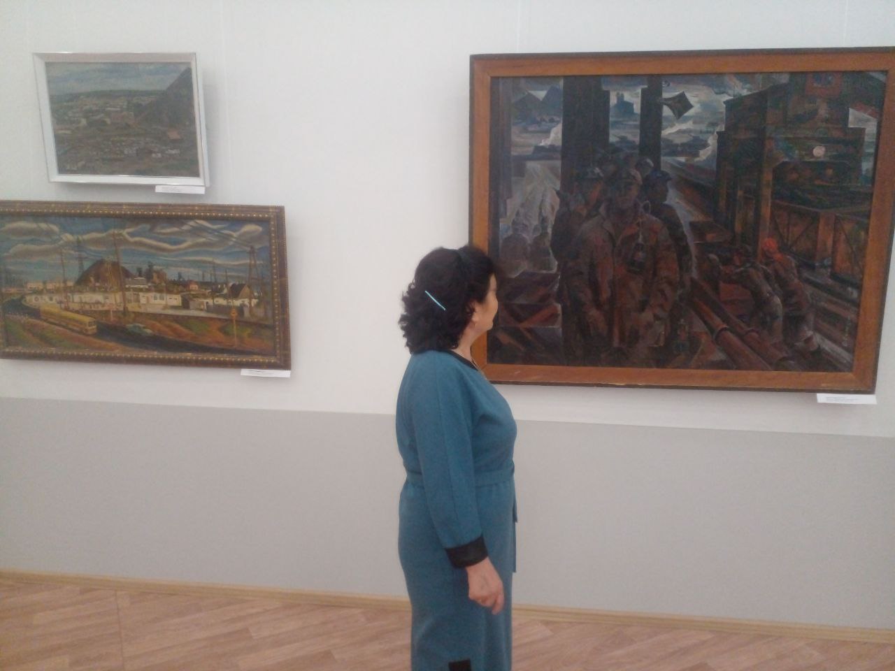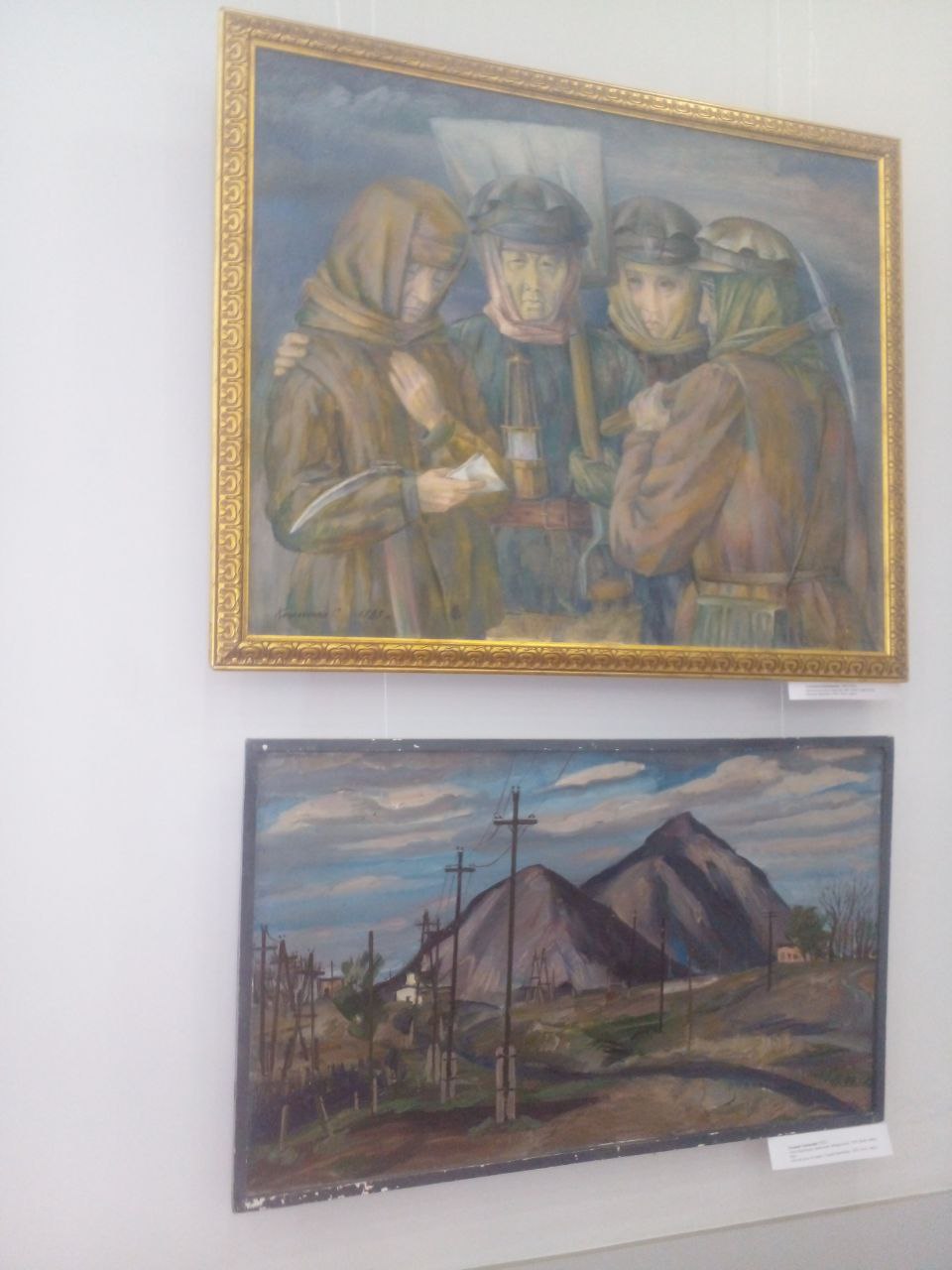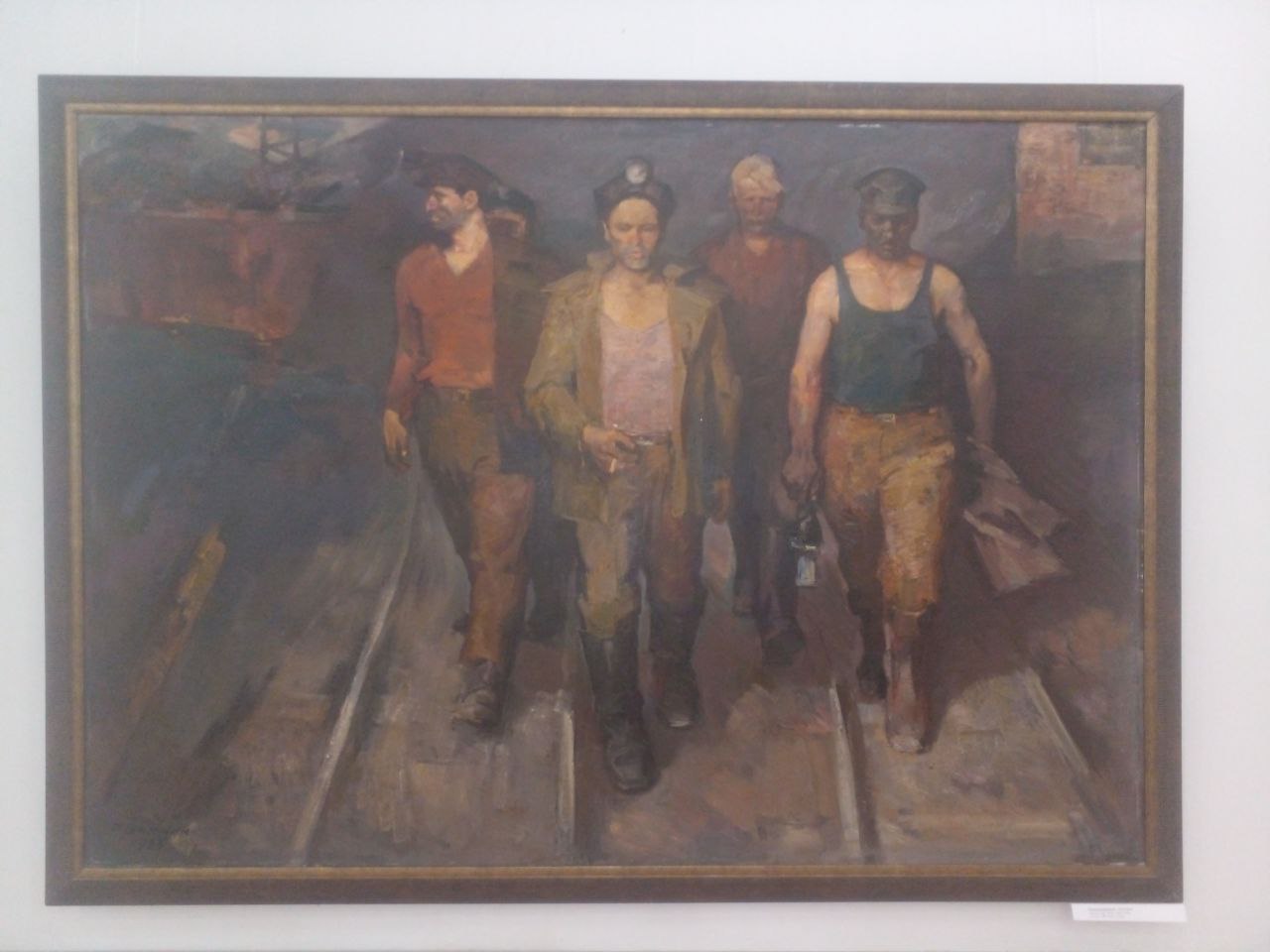На выставке мы видим шахты, многих из них сейчас уже нет. Есть на картинах такие шахты, как «Майкудукская», «Саранская», им. Кузембаева. Лейтмотивом проходит работа В. Шамшина «Уголь». Она написана в 80-х годах, но, тем не менее, это симфония о человеческом труде разных поколений. Все четыре человека, которые изображены на полотне, написаны с натуры. Многим художникам в советские времена «Шахтострой» давал разрешение на спуск в забои, чтобы писать шахтеров с натуры. Здесь мы видим, что они идут по узкоколейкам, а за ними художник показывает нам кусочек неба и терриконы, таким образом говоря своим полотном о торжестве труда.