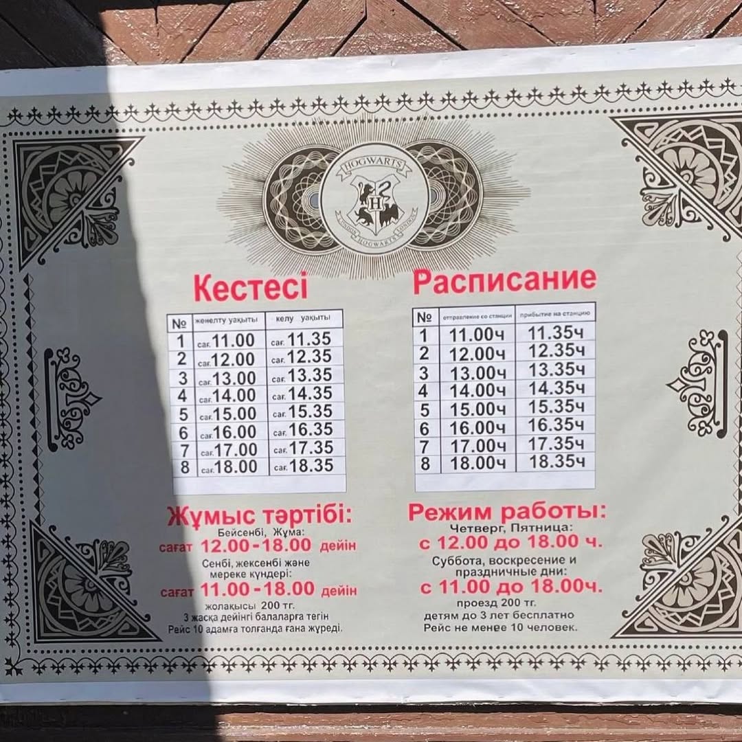 Как сообщили в городском управлении парками культуры и отдыха, экспресс «Хогвартс» отправится в путь с платформы 9 ¾. В этом году стоимость проезда не изменится. Для детей до трех лет бесплатно, для остальных пассажиров — 200 тенге.