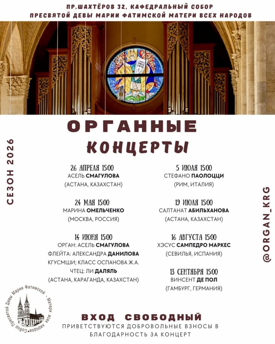 Кафедральный собор Пресвятой Девы Марии Фатимской, Матери всех народов, анонсировал расписание органных концертов.