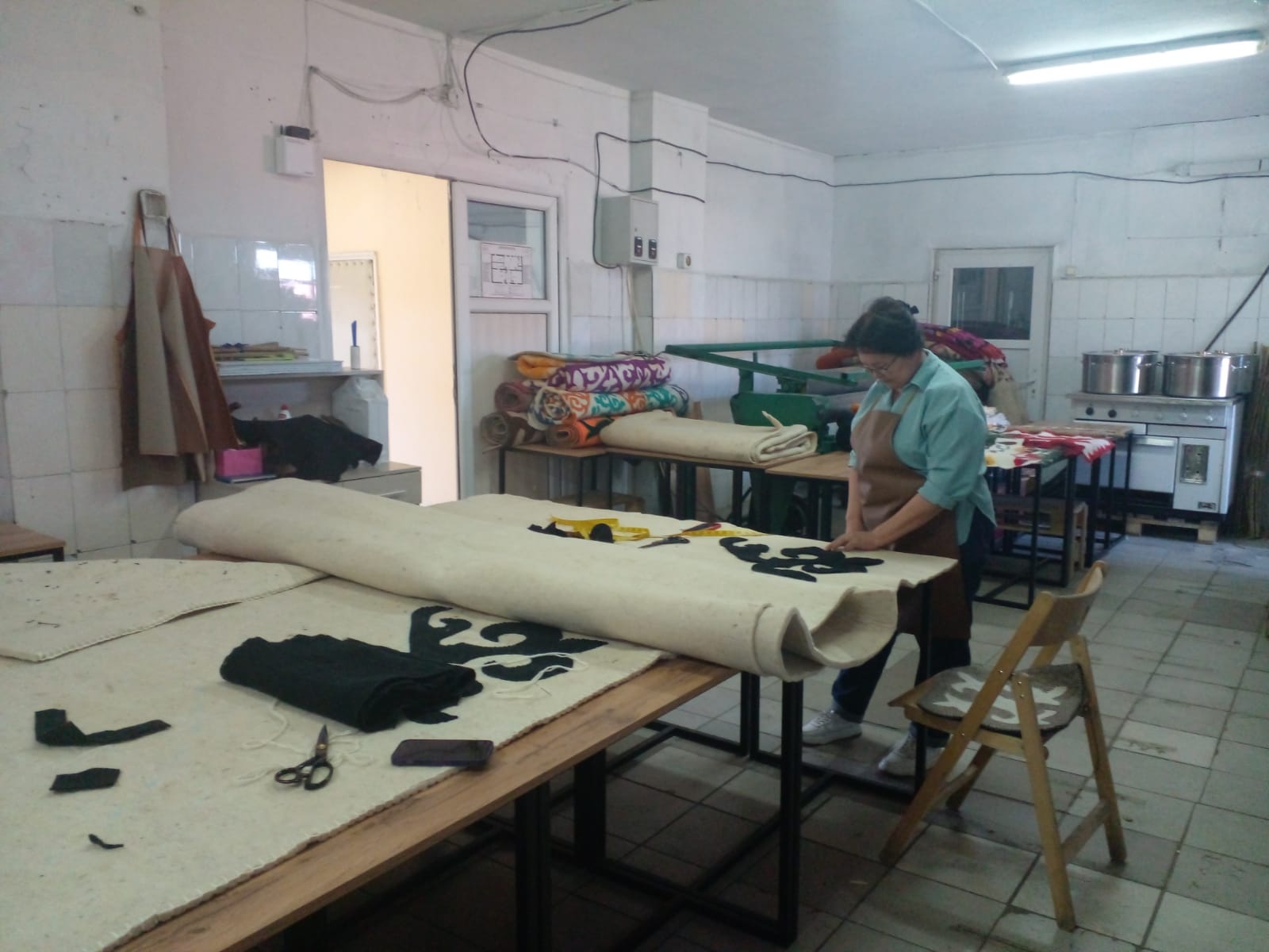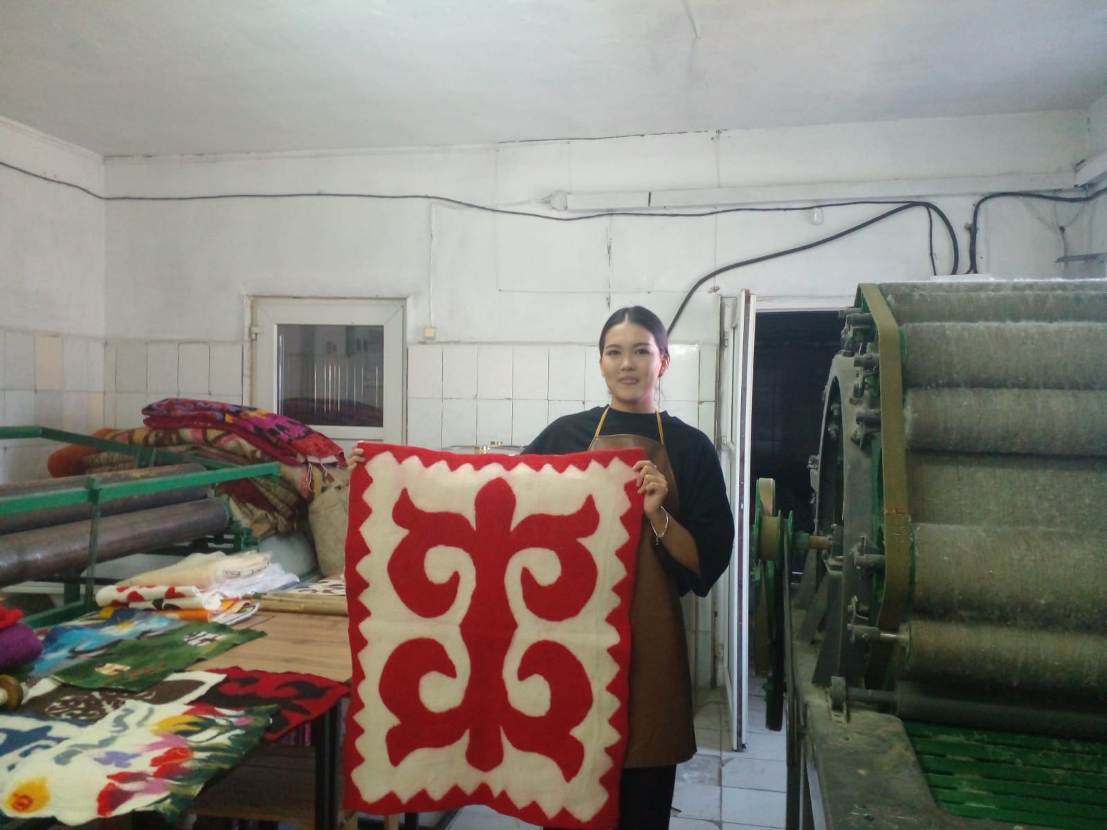 — Здесь делаем ковры. Основное сырье — шерсть. Ее мы сначала моем, чистим, обрабатываем, чтобы запаха не было. Затем следует сушка. Потом пропускаем через чесальную машину. Так материал становится однородным и пушистым, получается кардочес. Его мы уже красим, а после валяем, делаем нужной толщины и отправляем в специальный станок, где происходит прессование. В итоге получаем плотное полотно, из которого изготавливаем ковры, сырмак, текемет. В будущем хотим делать и көрпе, — делится планами Гүлпахат Құттыбаева.