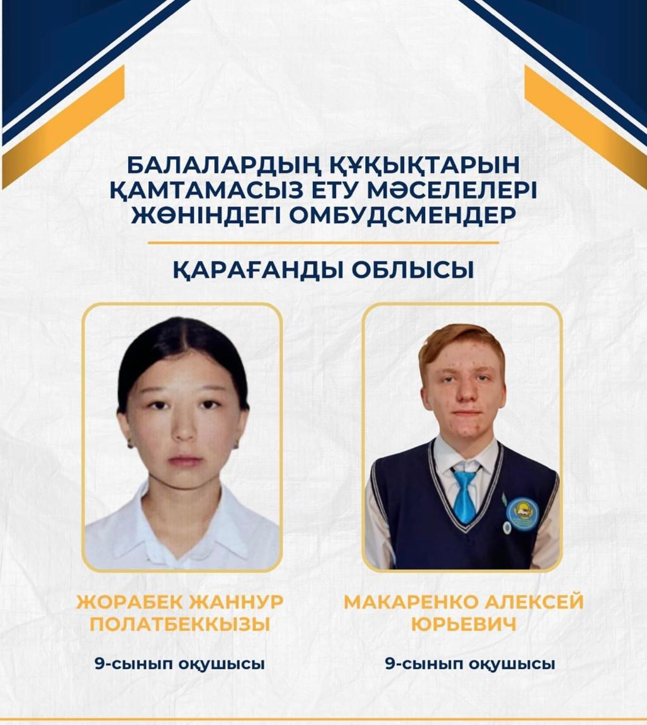 Детские омбудсмены появились и в Карагандинской области. Так, интересы детей будут представлять ученики девятых классов Жаннур Жорабек и Алексей Макаренко. Алексей учится в школе-лицее № 1 г. Сарань. Более шести лет старшеклассник серьезно занимается робототехникой в кружке в стенах своего учебного заведения. В этом году он стал чемпионом Казахстана на фестивале RoboLand в номинации «Водный лабиринт» — самостоятельно собрал и запрограммировал робота, который успешно преодолел все препятствия. Также неоднократно участвовал в серьезных республиканских состязаниях по программированию. Кроме того, летом юноша трудился в отряде «Жасыл ел» и был выбран улан-басы — лидером общественной организации школьников «Жас ұлан» по городу Сарани.
