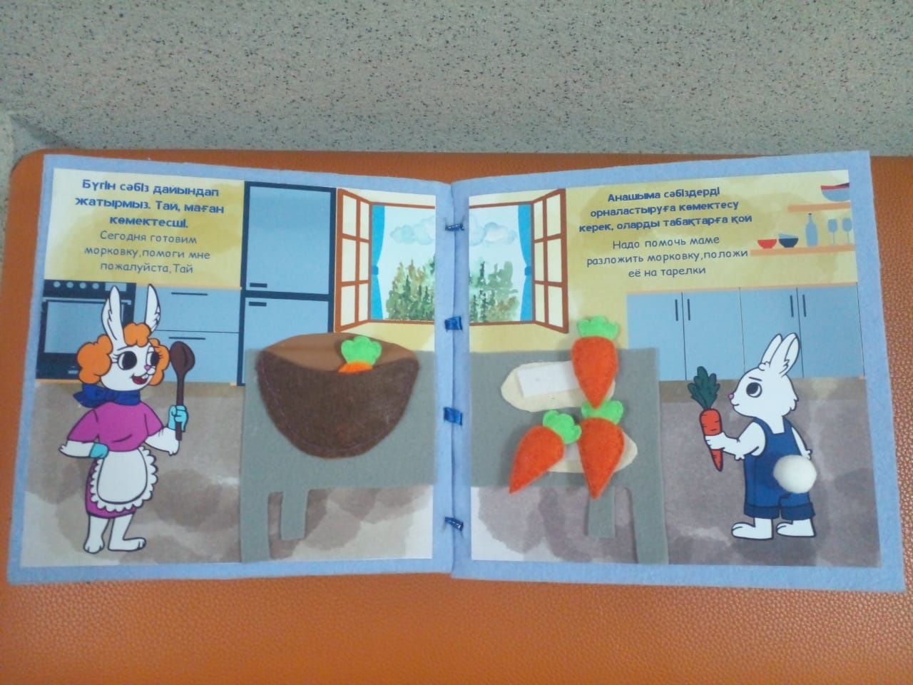 – Эта книга как семейная терапия. Родители читают детям сказку, а они в это время могут выполнять различные задания, встречающиеся в ходе повествования. Например, можно что-то раскрасить, есть какие-то элементы на липучках, которые нужно оторвать. Так ребенок проводит свой досуг, в увлекательной форме познает мир. Книга сделана в основном из картона и фетра. Эти материалы безопасны, – говорит Динара Мусаперова, вице-капитан по проектной части. – К слову, на задней обложке книги есть QR-код, по нему можно попасть в Телеграм-канал. Там прослушать сказки в аудиоформате. Всю книгу делали сами, придумывали текст, прорисовывали персонажей, никого не нанимали, – добавляет Надежда Соловьева, вице-капитан по административной части. – От идеи до создания прошло полтора года. Сказки не только читают, но и щупают. Есть тактильные элементы. Где-то надо липучку оторвать, где-то потянуть за резинку, что-то по цветам разместить или раскрасить. На каждом развороте свои задания. Тексты как на казахском, так и на русском языках.