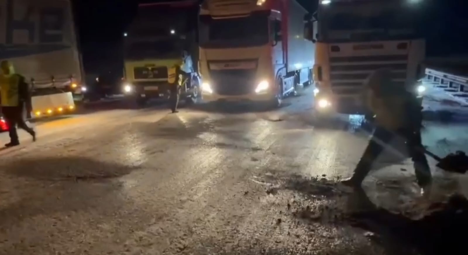 По данным пресс-службы ДП Карагандинской области, дорожный патруль периодически разрешает проезд автоколоннам. Вчера, например, поздно вечером от поселка Аксу-Аюлы до областного центра сопроводили 300 грузовых автомобилей. Интенсивные осадки, сильный порывистый ветер и периодический снег значительно осложнили дорожную обстановку. На самых опасных и скользких участках трассы движение транспорта оказалось затруднено — тяжелые грузовики не могли преодолеть подъемы. Не дожидаясь специализированной техники, сотрудникам полиции пришлось вручную подсыпать песок на проезжую часть.