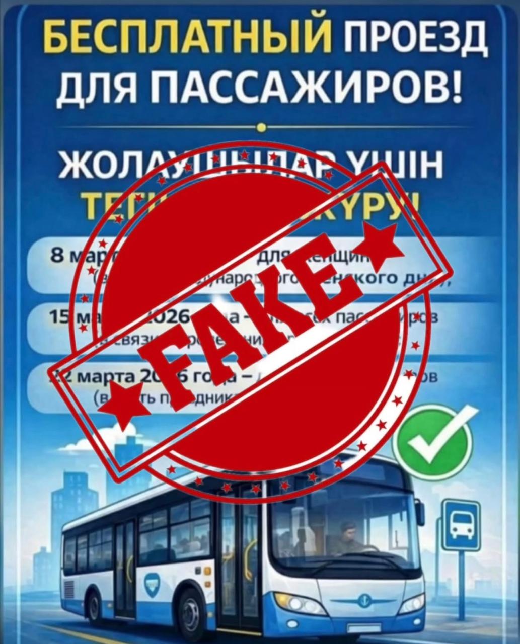 В социальных сетях активно распространяется недостоверная информация о якобы бесплатном проезде в общественном транспорте в праздничные дни — 8 марта (в честь Международного женского дня), 15 марта (день референдума) и 22 марта в период празднования Наурыза.