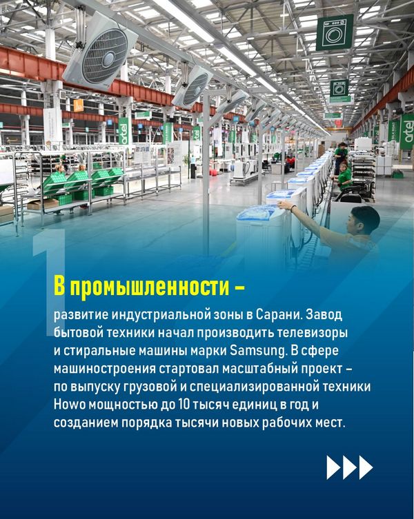 - Развитие индустриальной зоны в Сарани. Завод бытовой техники начал производить телевизоры и стиральные машины марки Samsung. В сфере машиностроения стартовал масштабный проект – по выпуску грузовой и специализированной техники Howo мощностью до 10 тысяч единиц в год и созданием порядка тысячи новых рабочих мест.