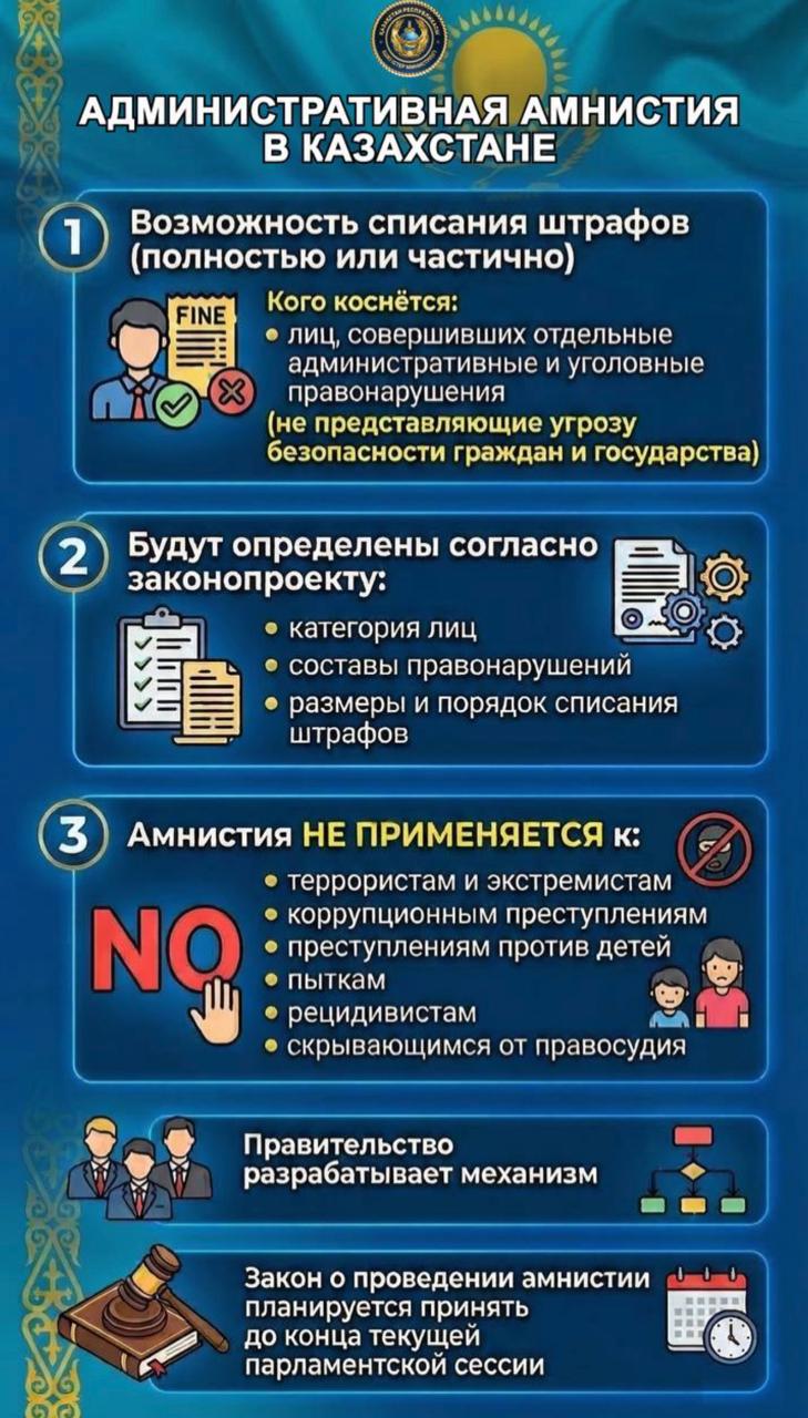 В настоящее время Министерством внутренних дел совместно с Министерством юстиции прорабатываются предложения по механизму реализации амнистии. Категории лиц, составы правонарушений, размеры и порядок списания штрафов будут определены при подготовке соответствующего законопроекта.
