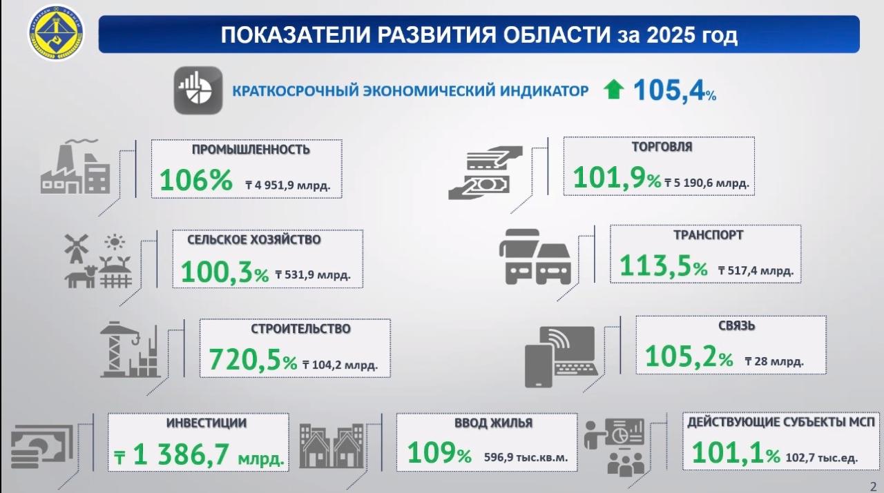 Что касается инвестиций, то по итогам 2025 года объем вложений в основной капитал составил порядка 1,4 трлн тенге, что свидетельствует о сохранении стабильной инвестиционной активности. Основные средства направлены в промышленность, энергетику и водоснабжение, транспортную инфраструктуру, строительство и социальную сферу. Главные вложения формировало продолжение реализации крупных проектов в промышленности. Так, в течение года было запущено 28 инвестиционных проектов на сумму более 279 млрд тенге, в том числе в сфере металлургии, машиностроения, производства строительных материалов, бытовой техники и развития возобновляемой энергетики. Также завершено строительство двух малых промышленных зон для размещения субъектов малого и среднего бизнеса.