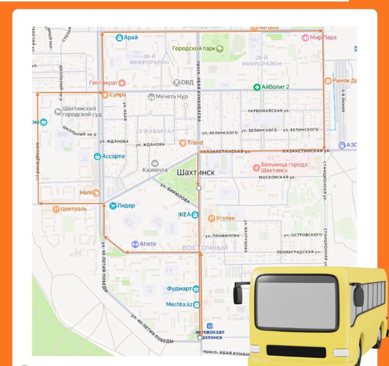 Движение автобусов будет осуществляться по утверждённой схеме. Маршрут проходит через следующие остановки: Вокзал — «Свет-Интерьер» — MAX — «Арман» — «Ерсан» — «Дента Ф» — Молодёжная, 49 — «Аврора» — «Арай» — «Универсам» — Школа №1 — 1 квартал — ВГСЧ — Роддом — ЦОН — «Табыс» — Фудмарт — Вокзал.