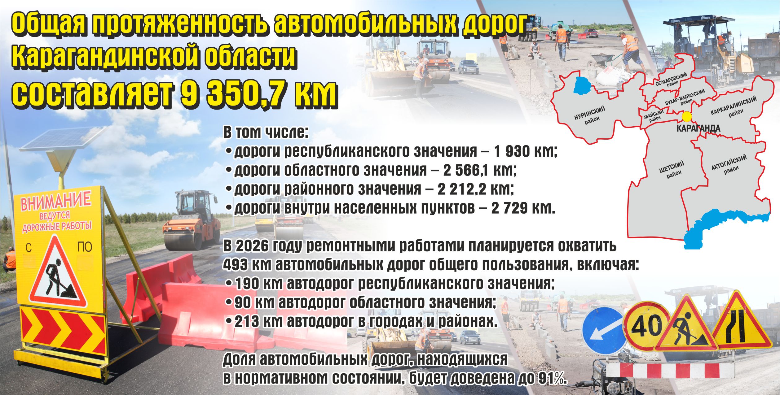 В Карагандинской области продолжается комплексная модернизация автомобильной инфраструктуры. В нынешнем и ближайшие годы реализуются проекты реконструкции, капитального и среднего ремонта автомобильных дорог республиканского и областного значения, а также мостов и путепроводов.
